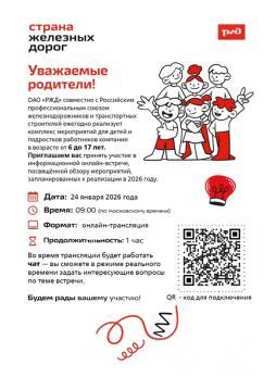 24.01.26 в 9-00 мск пройдёт обзор мероприятий РЖД "Страна железных дорог" на 2026 год. Принять участие можно, перейдя по QR-коду.